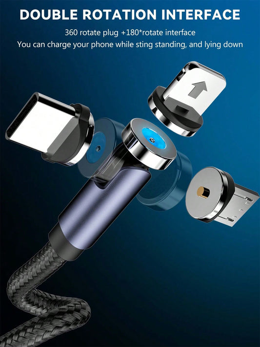 (1 Cable+3 Plugs)540 Rotate Magnetic Cable Fast Charging Micro USB Type C Cable USB C Cable Compatible With Iphone Samsung Xiaomi Fast Charger Cord Phone Data Wire 3 In1