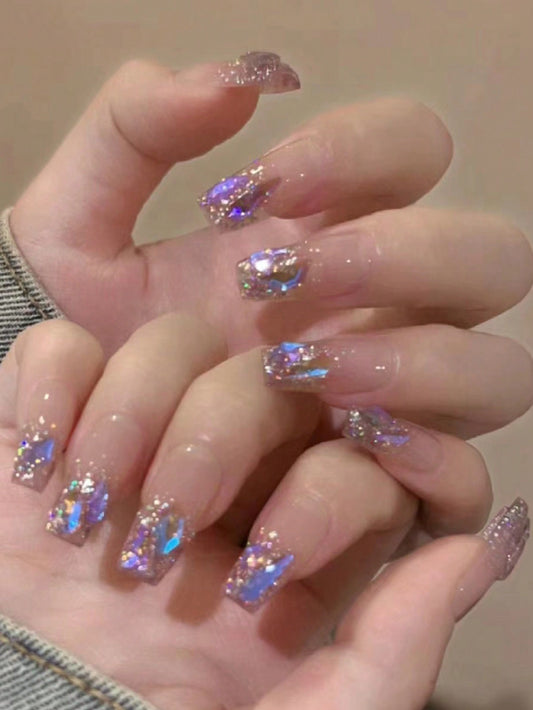 Elevate Your Style With, 24pcs Long Coffin Glitter & Translucence Design Fake Nail Set,Contain 1pc Jelly Glue And 1pc Nail File Press On Nails Nail Supplies
