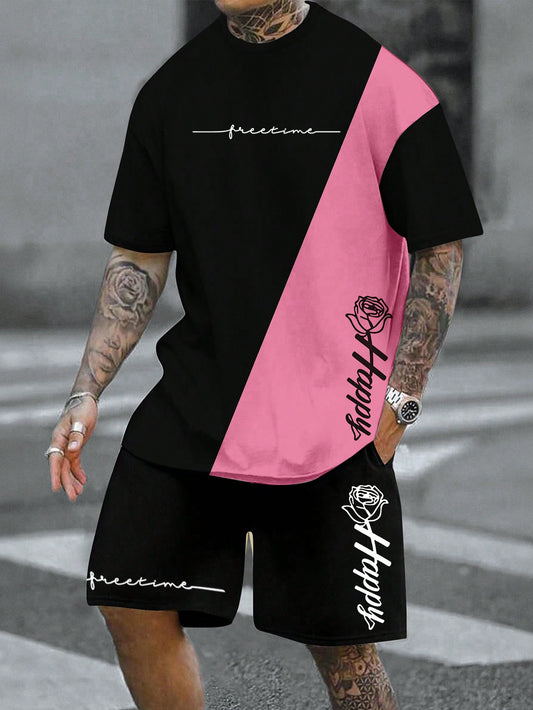Manfinity LEGND Men's Summer Letter & Floral Print Round Neck Short Sleeve Casual T-Shirt And Drawstring Waist Shorts Set