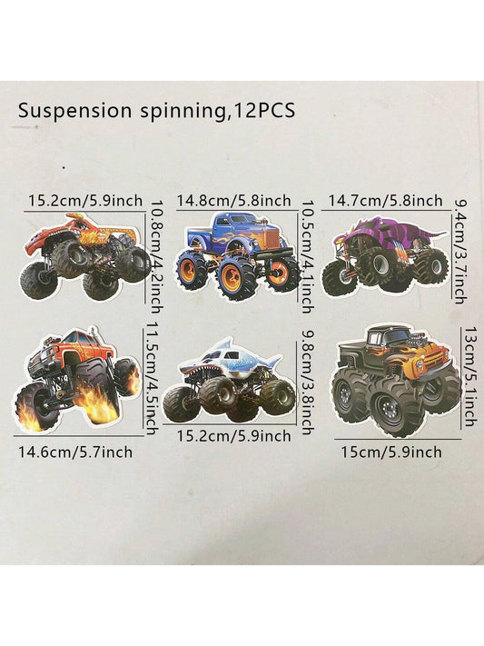 12pcs/Set Monster Truck Theme Party Spiral Hanging Decoration, 6 Different Patterns With 2pcs For Each Pattern, PVC Hanging Ornaments For Floral Arrangement, Window Display, Corridor And Ceiling Decorations