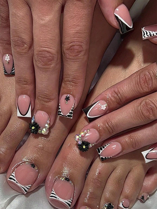 24pcs Short-Length INS-Style Lovely Ballet Bowknot French Gold & Pink Onion Powder Print Glittering 3D Rose Camellia Rhinestone Pearl Sweet Square Nail Tips + 1pc Jelly Glue + 1pc Nail File Set Press On Nails Supplies